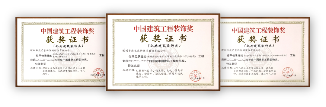 本次由建藝集團承建的“濱海廊橋工程裝飾工程標段2(F地塊-H地塊)項目、深圳大學西麗校區建設工程(二期) 項目裝修裝飾工程 VI 標段、深圳灣實驗室過渡場地二期裝修工程(二標段)”三個項目榮獲2023~2024年度“中國建筑工程裝飾獎”。