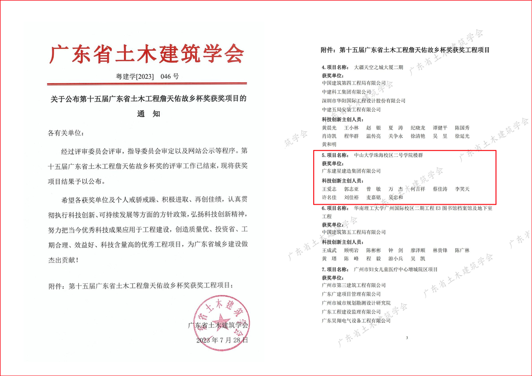近日,“2023年廣東省土木建筑工程技術創新交流及成果展示會”在廣州召開。建藝集團控股子公司建星集團承建項目中山大學珠海校區二號學院樓群再獲第十五屆廣東省土木工程“詹天佑故鄉杯”獎,集團榮譽又添碩果。