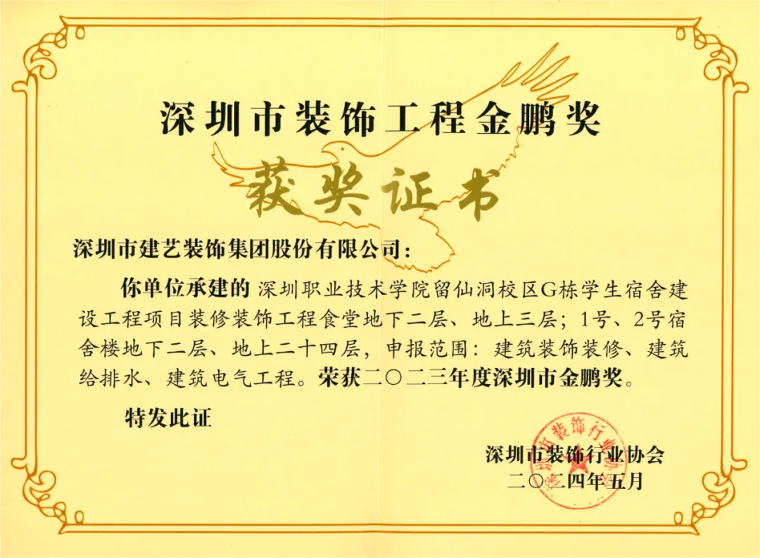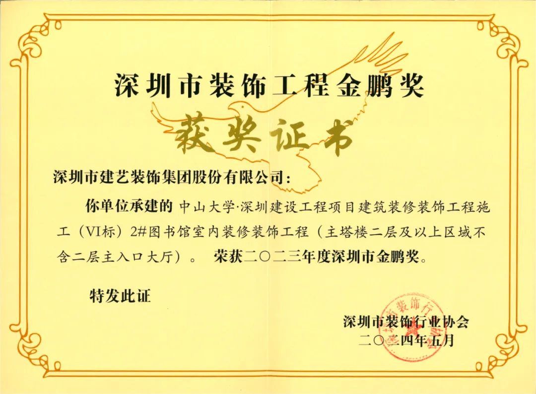 近日,由深圳市裝飾行業(yè)協(xié)會(huì)組織評(píng)選的2023年度深圳市裝飾工程“金鵬獎(jiǎng)”獲獎(jiǎng)名單揭曉,由建藝集團(tuán)承建的中山大學(xué)?深圳建設(shè)工程項(xiàng)目建筑裝修裝飾工程施工(VI標(biāo))、深圳市中醫(yī)院光明院區(qū)一期項(xiàng)目建筑裝修裝飾工程施工II標(biāo)項(xiàng)目、深圳職業(yè)技術(shù)學(xué)院留仙洞校區(qū)G棟學(xué)生宿舍建設(shè)工程項(xiàng)目裝修裝飾工程,共計(jì)3項(xiàng)工程榮獲嘉獎(jiǎng),企業(yè)的技術(shù)優(yōu)勢(shì)和施工水準(zhǔn)再獲行業(yè)肯定。